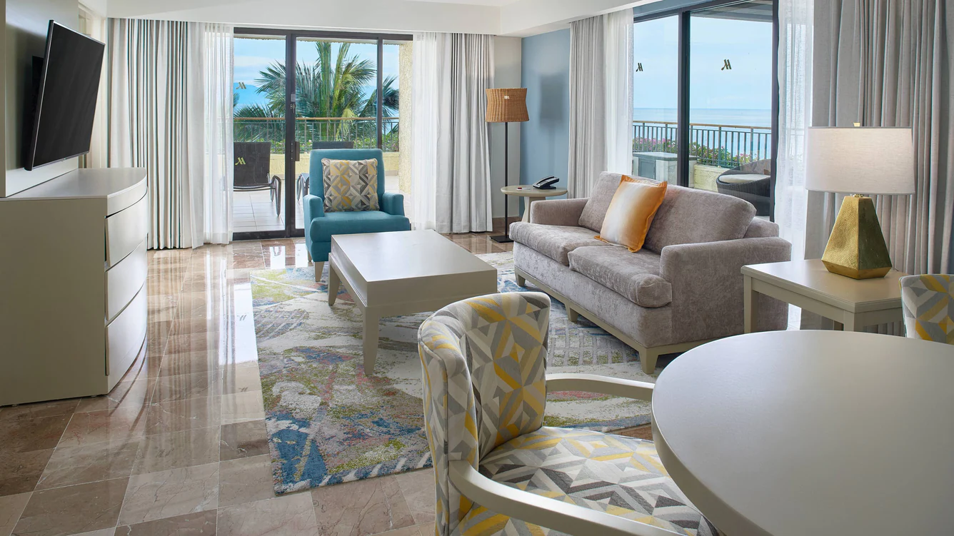 A larger version of the Junior Suite at 692 sq/ft with king one-bedroom, separate living room, balcony, and full ocean view. Includes a pull-out sofa bed and an expansive terrace.