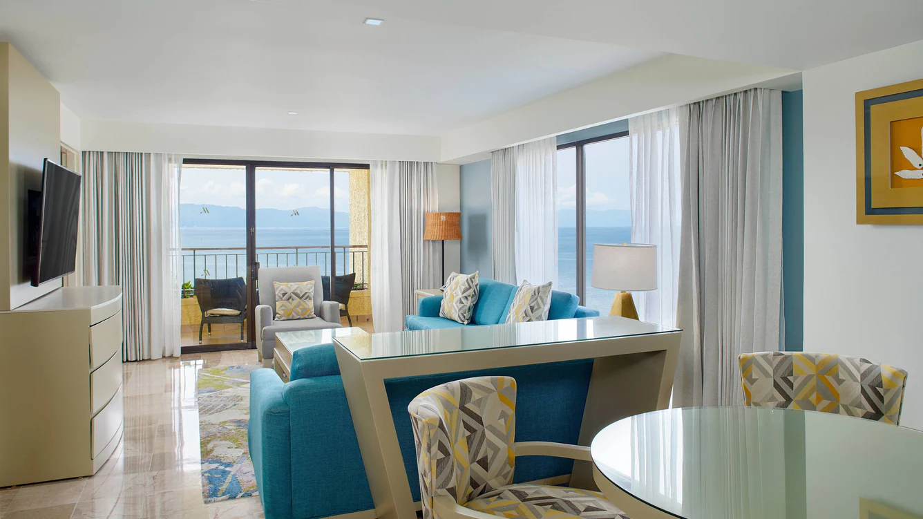 Truly luxurious 823 sq/ft king one-bedroom suite with separate living room. Both the main bedroom and the separate living room open up to the expansive balcony overlooking Banderas Bay. Perfect for a relaxing stay, and ideal for entertaining.